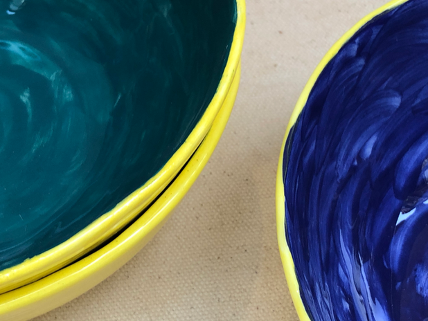 Piezas hechas en barro blanco y decoradas en dos tonos, con engobes de colores en la parte de dentro y con esmaltes por fuera (tanto los engobes como los esmaltes están hechos en el taller para conseguir una gama de color más personal). Estos cuencos tienen un diámetro de 16cm aproximadamente y una altura de 6cm.