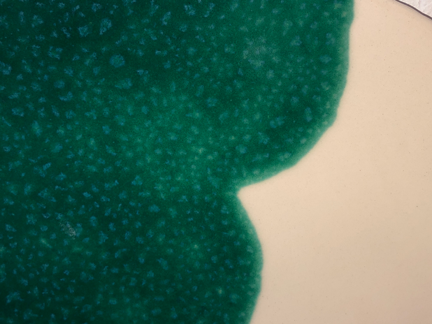 Bajo plato en loza o barro blanco, de aproximadamente 31cm de diámetro, y decorado con unas pinceladas de color.